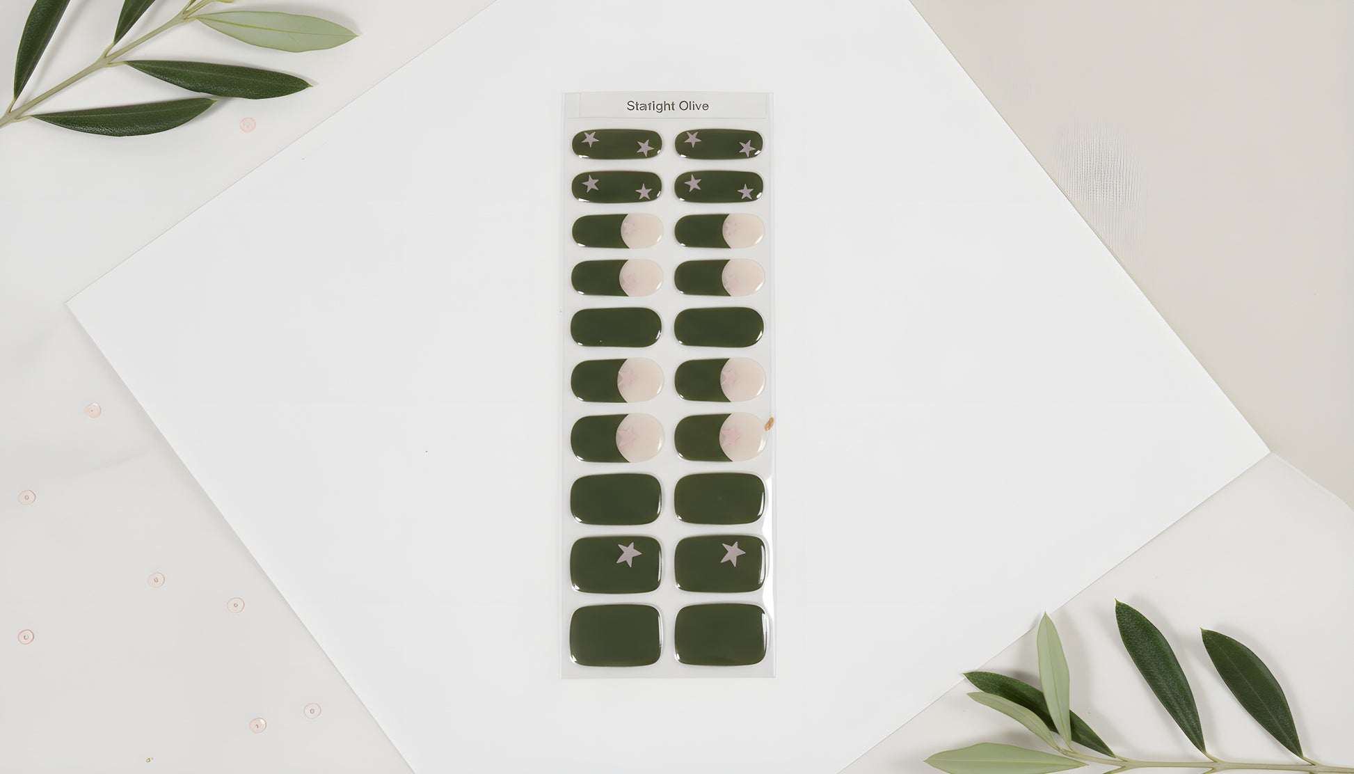 Starlight Olive is calm, cool, and a little bit cosmic. Soft olive green tones meet sleek French tips and a delicate star accent for a touch of understated magic. Perfect for anyone who loves earthy elegance